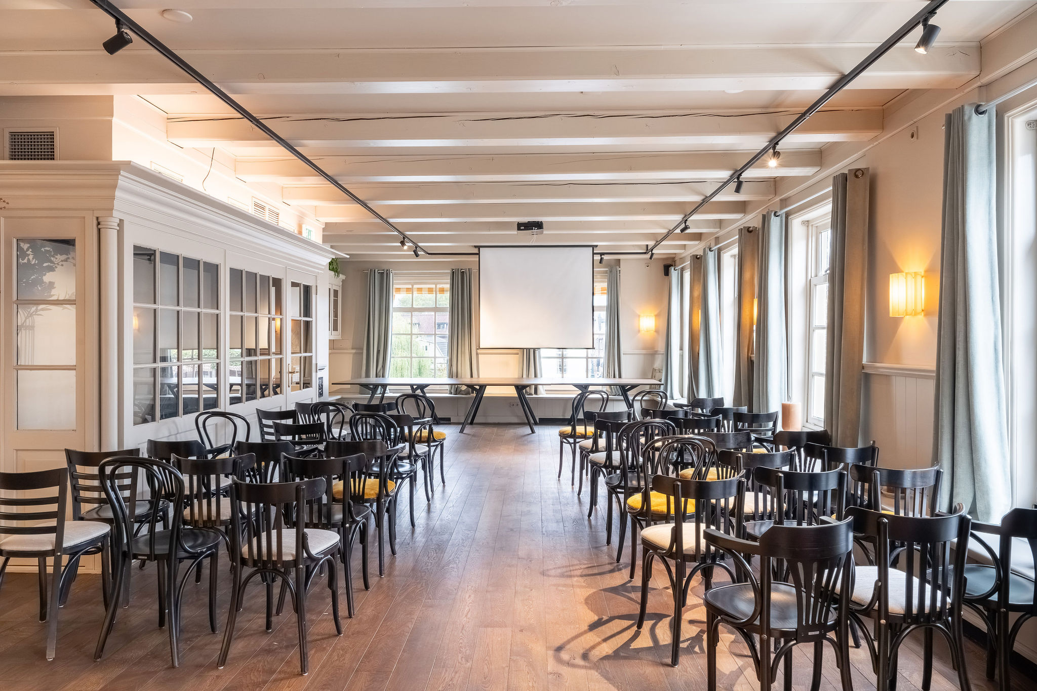 De ruimte van 75m2 heeft 2 zithoeken en een groot vergadergedeelte met uitzicht op de Groote Zeesluis van Muiden en het topje van het Muiderslot.