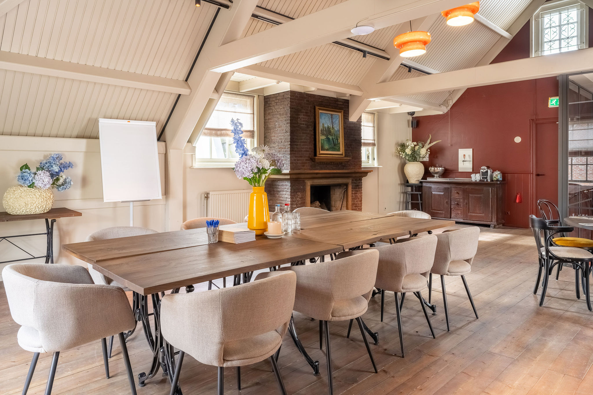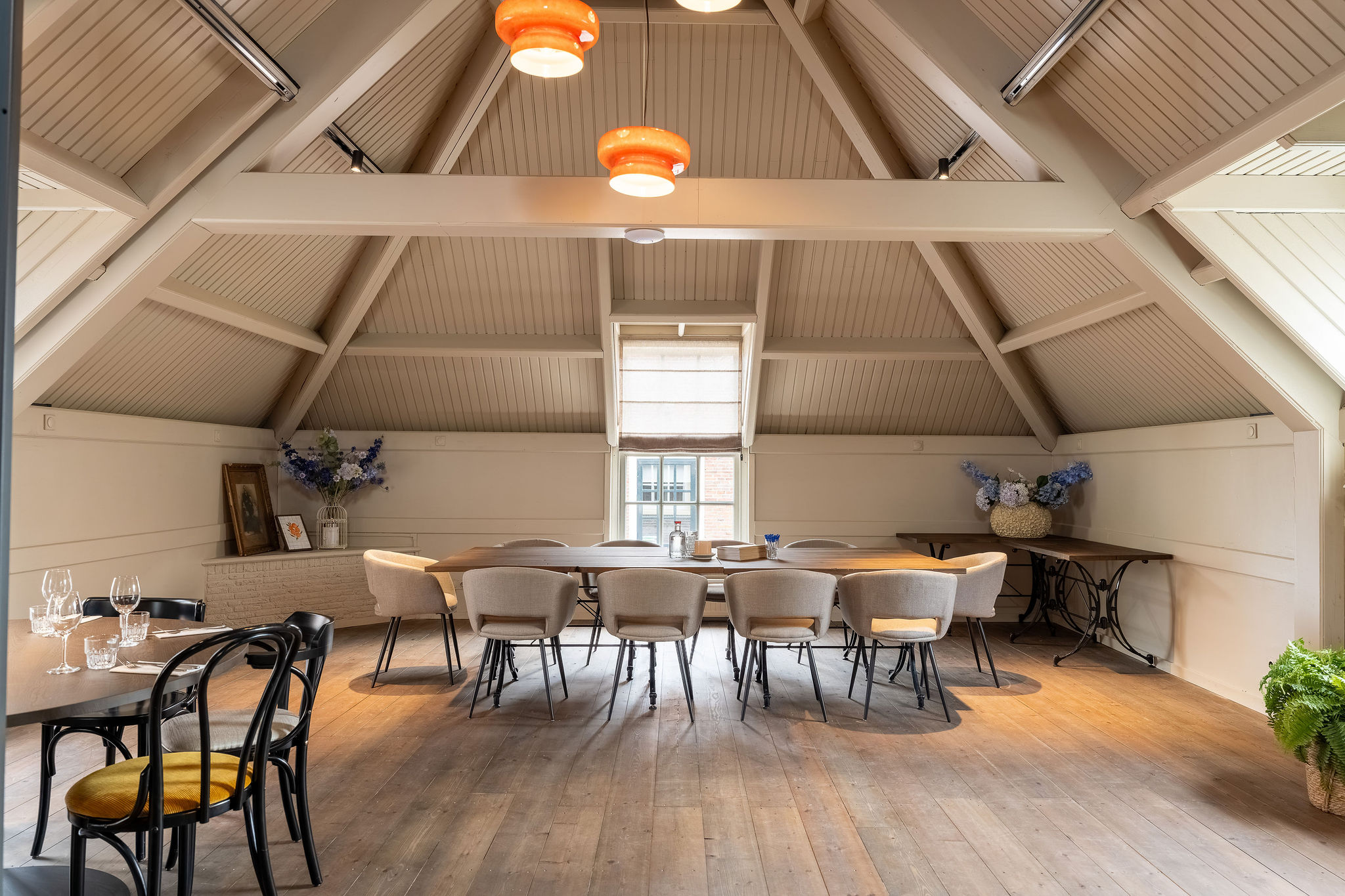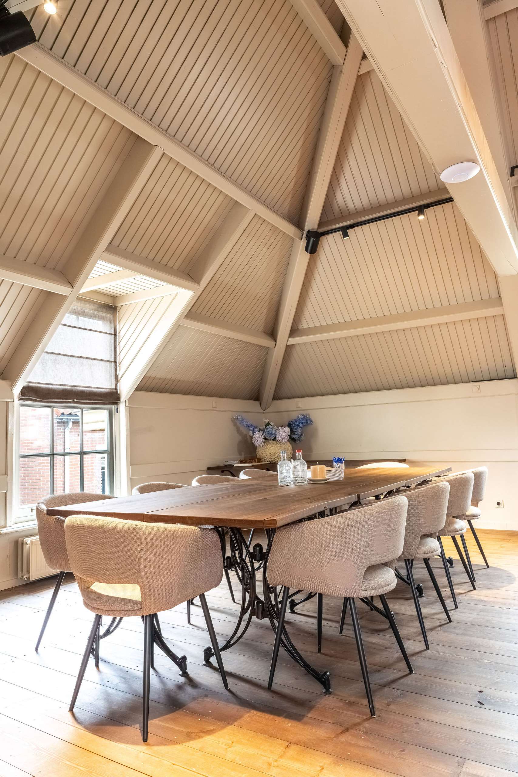 Op de eerste verdieping hebben we een grote ruimte met een prachtige nok. De ruimte straalt rust uit en heeft een huiselijke sfeer. Het perfecte decor voor kleinere groepen.
